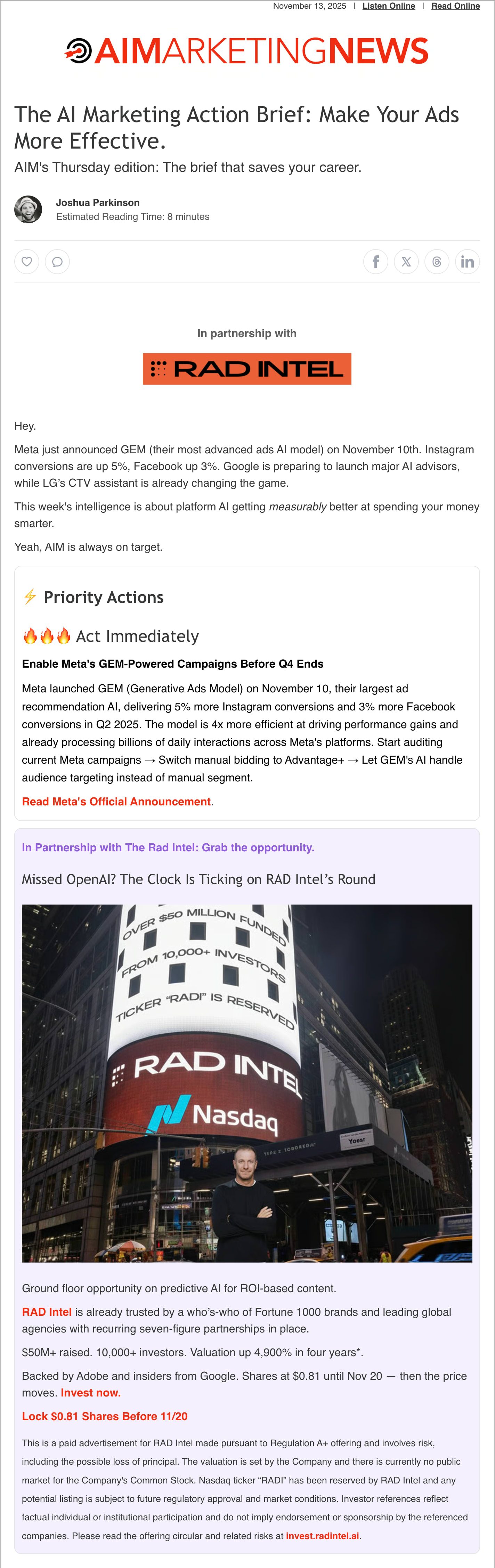 Weekly AI marketing insights for marketing professionals who drive real results. Direct, jargon-free content with high engagement. We write and optimize your ad copy for maximum impact—completely free. If your brand serves marketers using AI, let's connect.